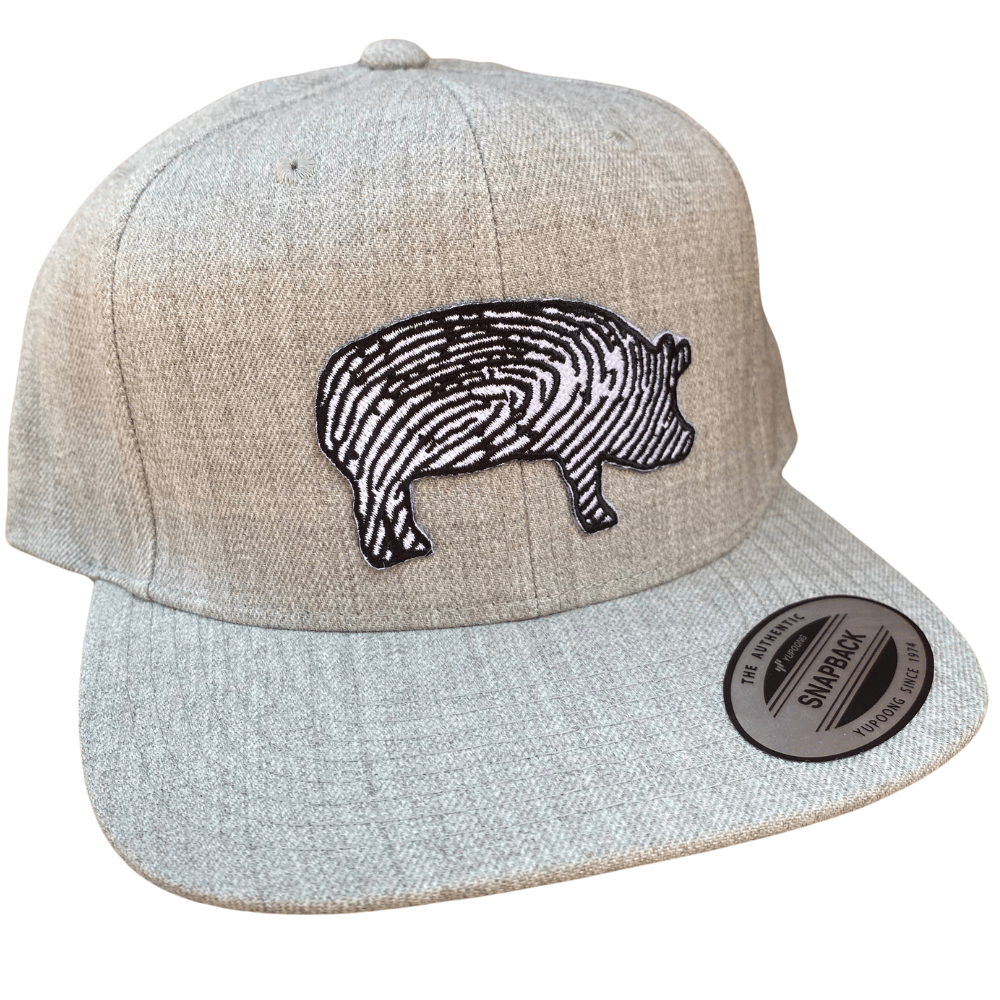 This heather grey snapback flat bill hat features our iconic Pig Print logo on a embroidered front patch.