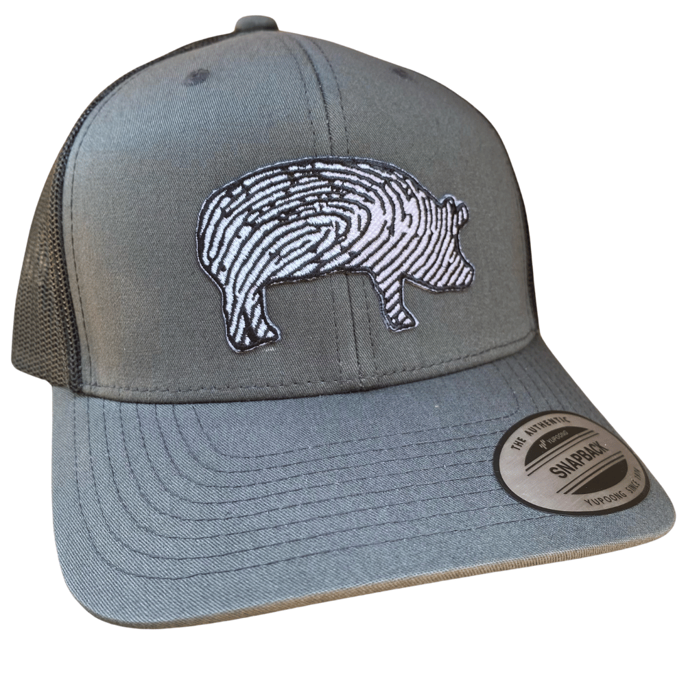 This grey/black snapback trucker hat features our iconic Pig Print logo on a embroidered front patch.