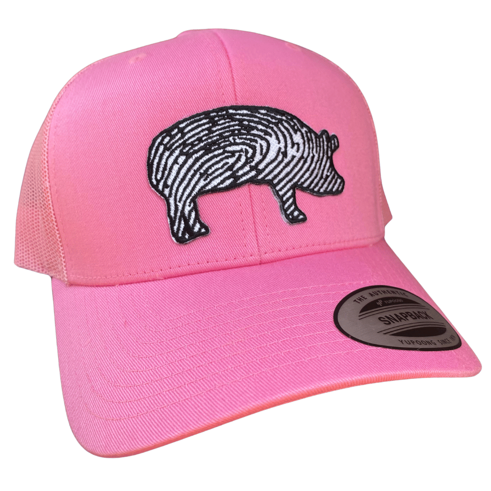 This pink snapback trucker hat features our iconic Pig Print logo on a embroidered front patch.